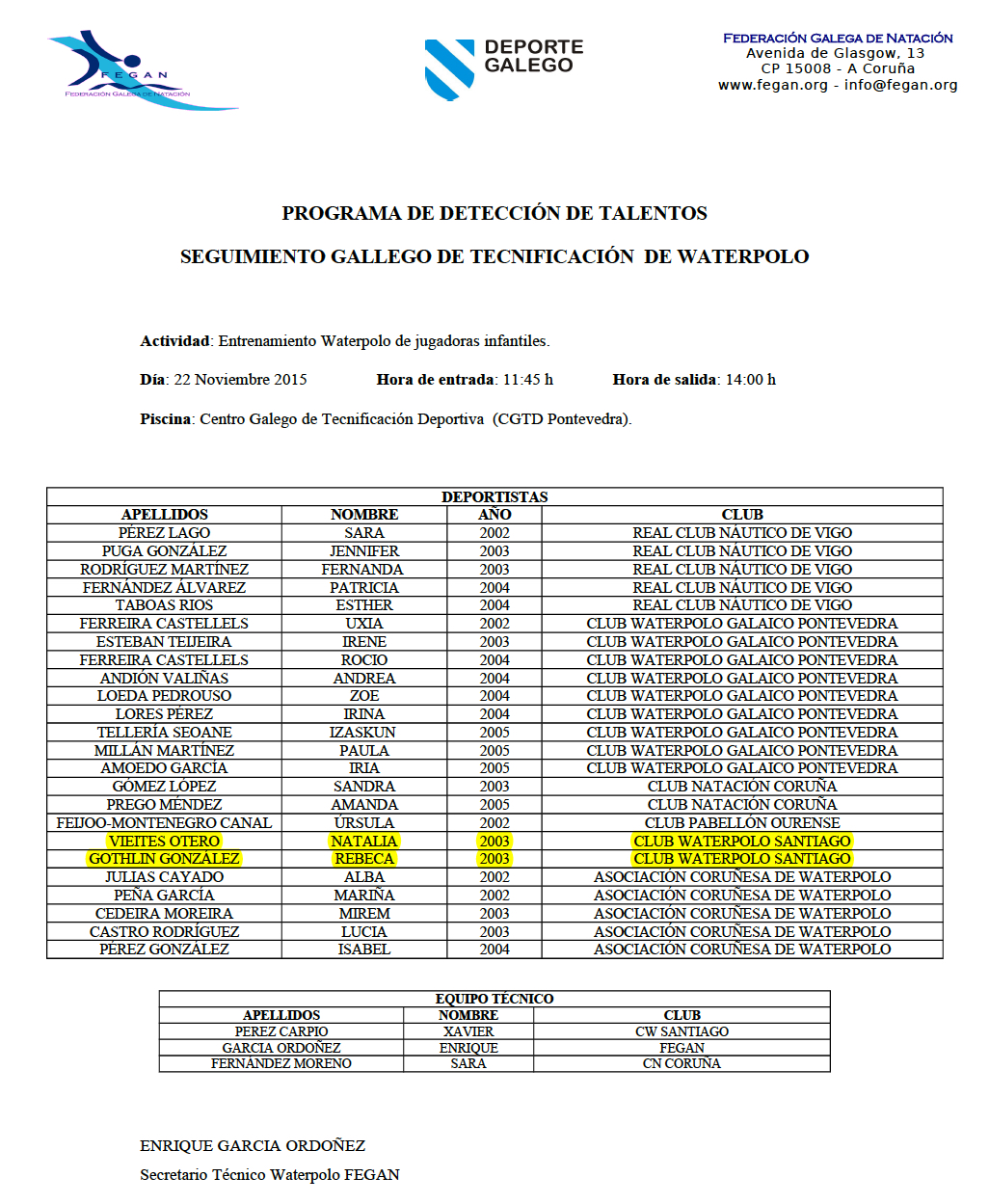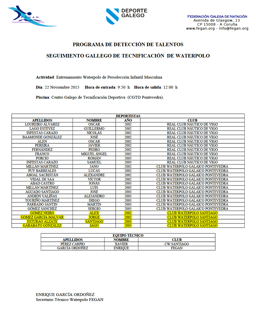 Comunícase ós xogadores do Club Waterpolo Santiago, tanto femeninos como masculinos, das seguintes listas, a súa convocatoria á concentración que terá lugar o vindeiro domingo 22 de Novembro, nas instalacións do Centro Galego de Tecnificación Deportiva, sitas en Pontevedra.
