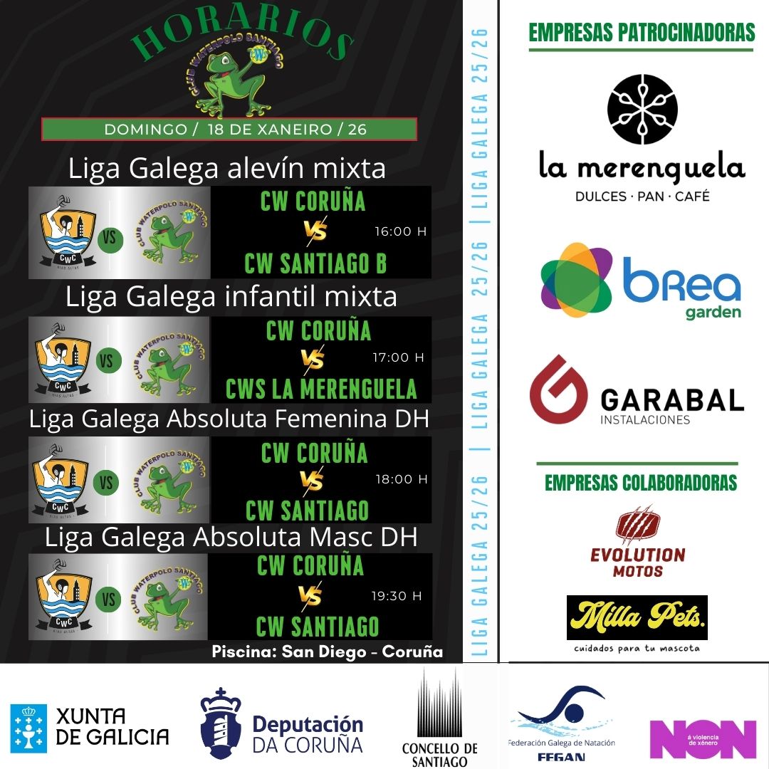 Este domingo 18 de xaneiro de 2026, a Piscina de San Diego (A Coruña) acollerá unha intensa xornada de waterpolo correspondente á Liga Galega 25/26, con ata catro encontros oficiais nos que o CW Coruña será protagonista.